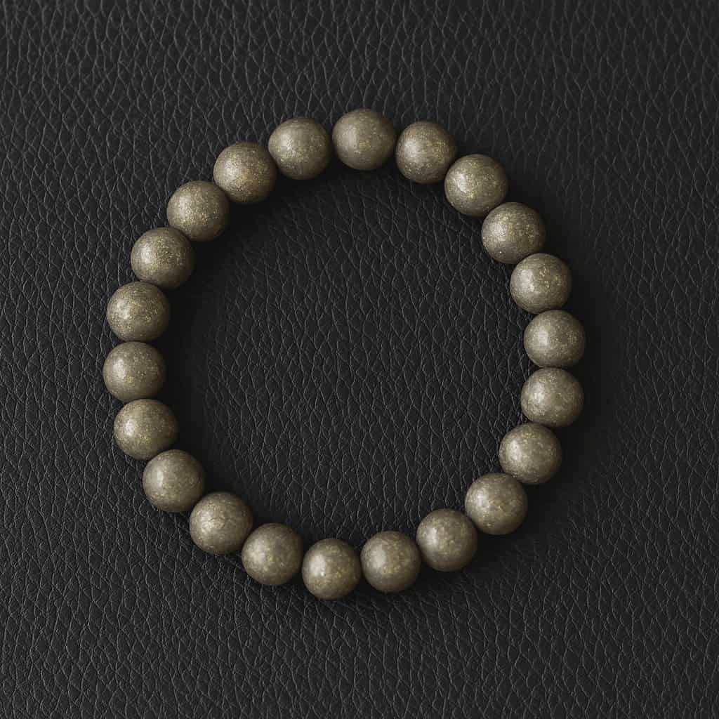 Élégant bracelet composé de perles rondes de 8 mm en pyrite naturelle, soigneusement polies pour révéler leur éclat doré métallique.