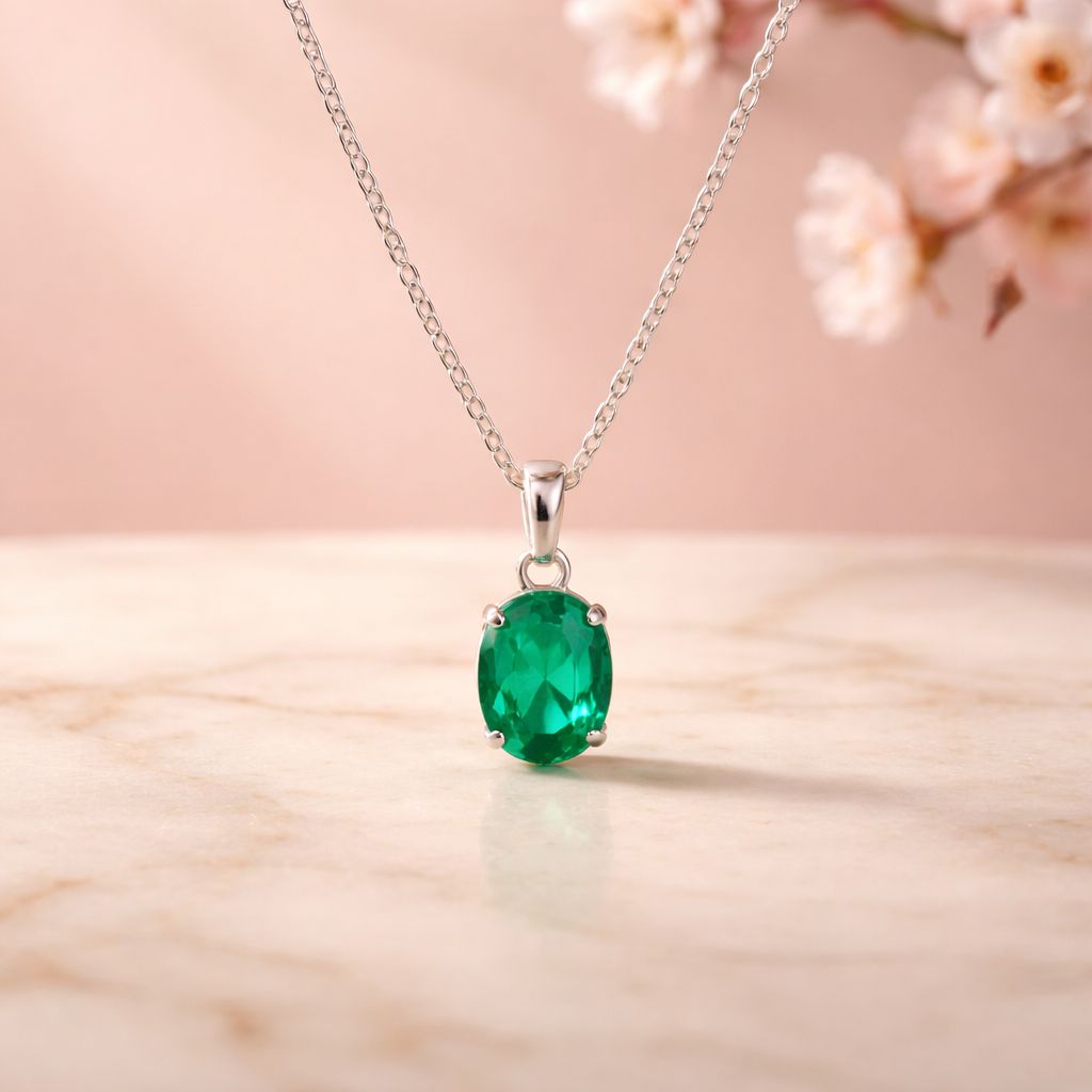 Ce pendentif met en valeur une émeraude naturelle ovale à facettes (5,1 × 6,9 × 3,2 mm), d’un vert vif et lumineux, symbole d’amour et de prospérité.