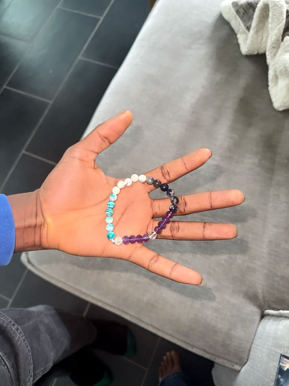 Grâce à l’alliance harmonieuse de ses pierres naturelles (sodalite, howlite, amazonite, améthyste et cristal de roche), ce bracelet agit comme un véritable cocon énergétique au quotidien :