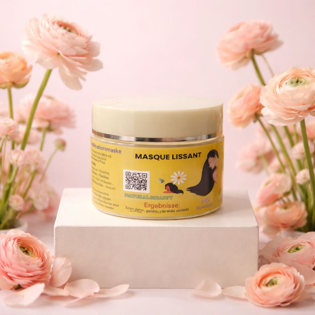 Le Masque Lissant Sublimateur est une véritable infusion de douceur et de nutrition, spécialement formulée pour transformer les cheveux indisciplinés en une chevelure souple, lisse et éclatante. Sa texture onctueuse révèle un concentré d’actifs naturels soigneusement sélectionnés pour offrir soin, force et brillance dès la première application.