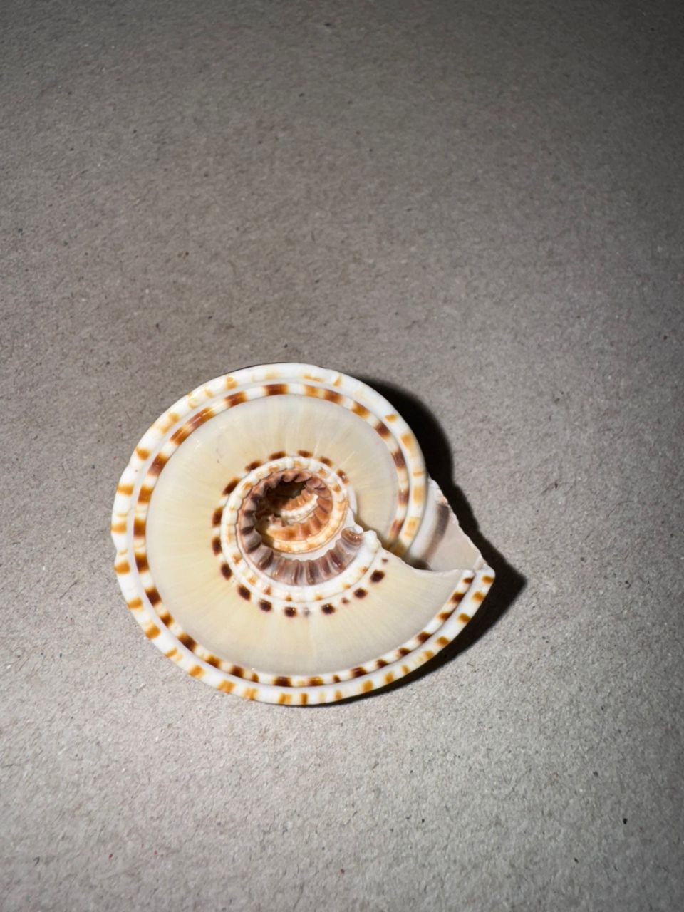 Magnifique œil de Shiva naturel, d’un diamètre de 4 cm, aux cercles concentriques parfaits dans des nuances de beige et brun. Cette pièce est polie naturellement par la mer, offrant une surface lisse et brillante.