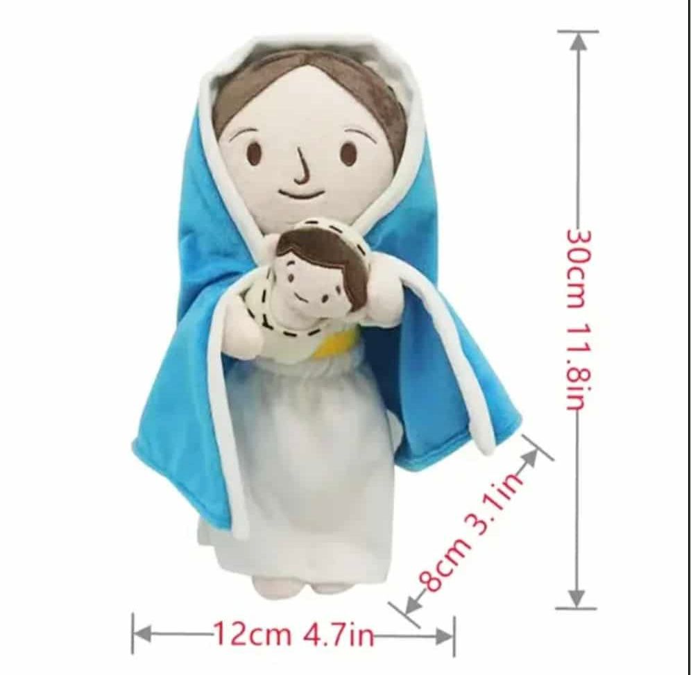 Fabriquée en tissu doux et rembourrage moelleux, elle est parfaite pour la catéchèse, la prière familiale ou comme cadeau spirituel pour les enfants.